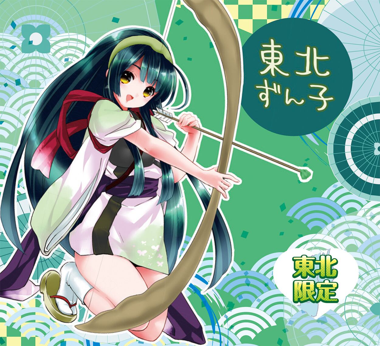 ずんだアローをかまえた「東北ずん子」がしゃがんでいるデザイン。