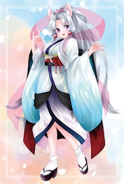 柔らかなグラデーションが美しい着物に身を包み、優雅に舞うようなポージングが印象的な「東北イタコ」のデザイン。